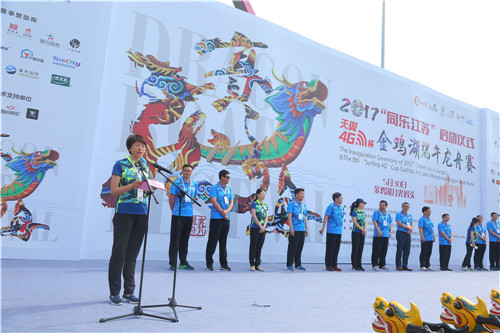 在现场万众期待的目光中,台上领导“画龙点睛”并敲响了铜锣,嘹亮的锣声回荡在月光码头,2017年金鸡湖端午龙舟赛正式开始!