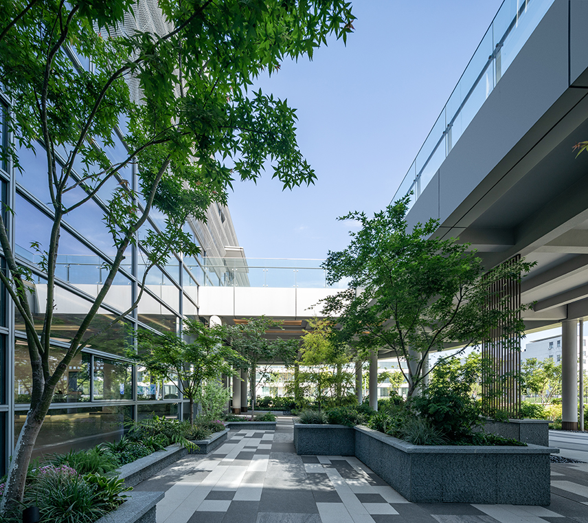项目为两栋高层的建筑形式,结合生产的需求以及工业建筑参观流线的需求。方案设计以城市界面和肌理作为切入点,严格按照建设项目规划条件及城市设计要求,将塔楼布于地块西南角和东北角,这样为场地东南角预留出一个大的宽敞公共广场,完美的融入到城市界面中去,更加直接的展示沛嘉医疗的自身的形象。同时,通过外围廊的联系,使两座高层形成一个整体。各栋建筑用弧形的飞桥相联系。景观飞桥将建筑单体结合成统一整体。形成立体的交通景观系统。地面,空中的景观延伸进入室内,展现独具特色的总部园区。